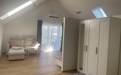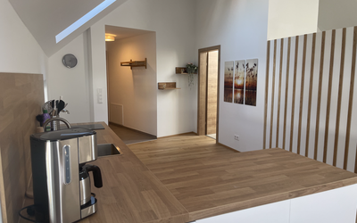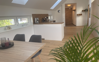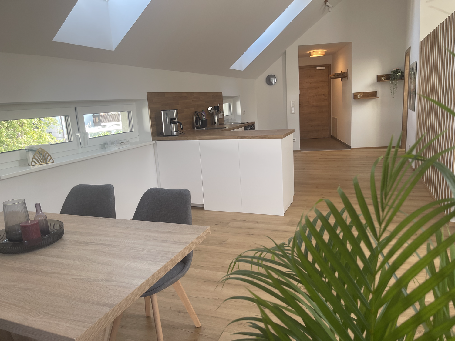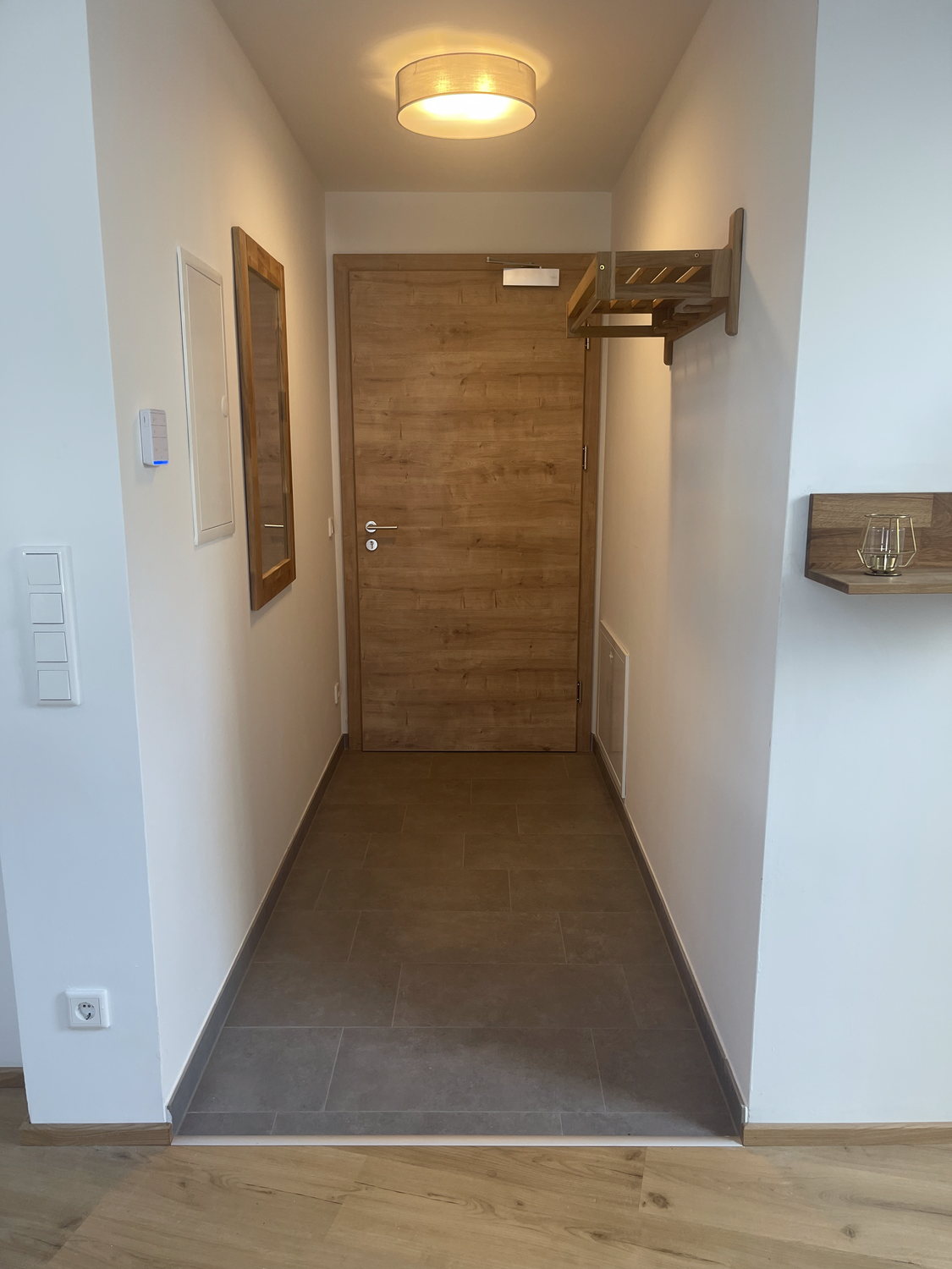 Das Appartement liegt im ersten Obergeschoß unter dem Dach und eignet sich ideal für Familien und Paare. Unter den Dachschrägen sind die Räume bis über vier Meter hoch – sie verleihen der neu errichteten Wohnung einen Loft-Charakter und laden zum Entspannen ein.