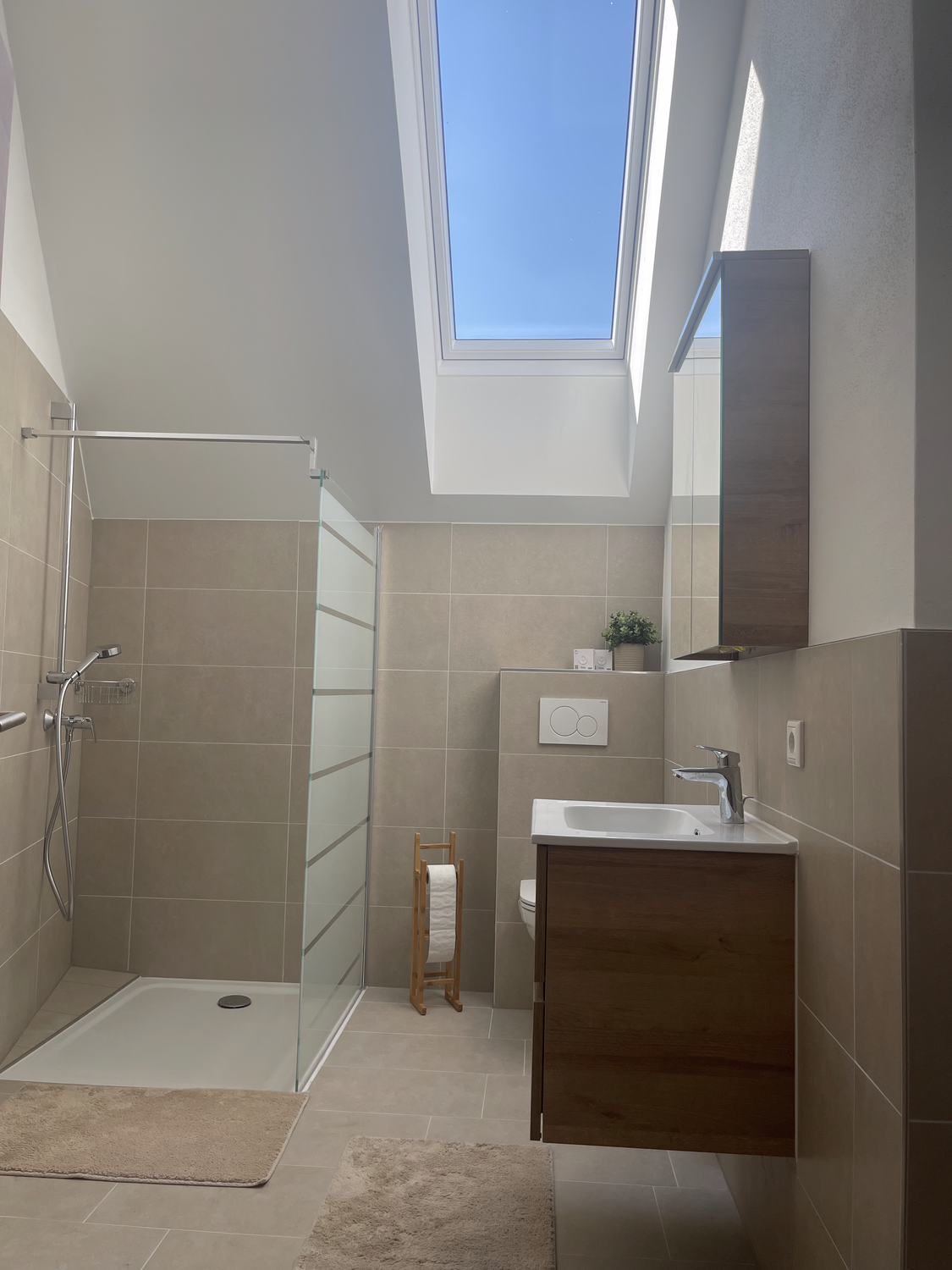 Ein großes Dachfenster durchflutete das Badezimmer mit Licht. Dieses verfügt über eine barrierefreie Dusche, ein WC, ein Waschbecken sowie eine Waschmaschine. Ausreichend Hand- und Badetücher liegen bei eurer Ankunft bereit. Ein Föhn ist ebenso vorhanden.