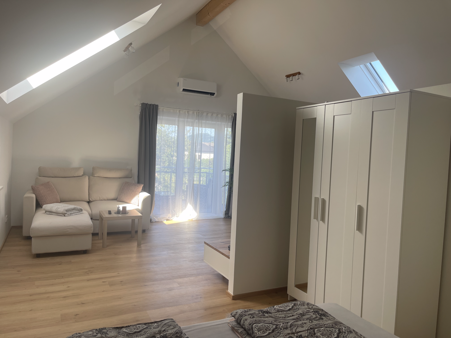 Das mit viel Liebe zum Detail gestaltete Appartement lässt keine Wünsche offen: Über einen privaten Eingang kommt ihr in die helle Wohnküche. Esstisch, Sofa und ein großer Balkon laden zum Verweilen ein – Blick auf den Untersberg inklusive. Eine Klimaanlage sorgt an heißen Sommertagen für angenehme Temperaturen. Im lichtdurchfluteten Badezimmer erwarten euch eine große Dusche, WC und ein Waschtisch.
