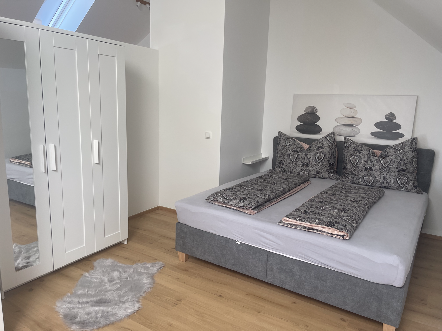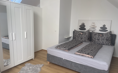 Im Schlafzimmer lädt ein bequemes Doppelbett zum Träumen ein. Ein großer Kleiderschrank bietet Platz für eure Kleidung. Bettwäsche wird zur Verfügung gestellt.
