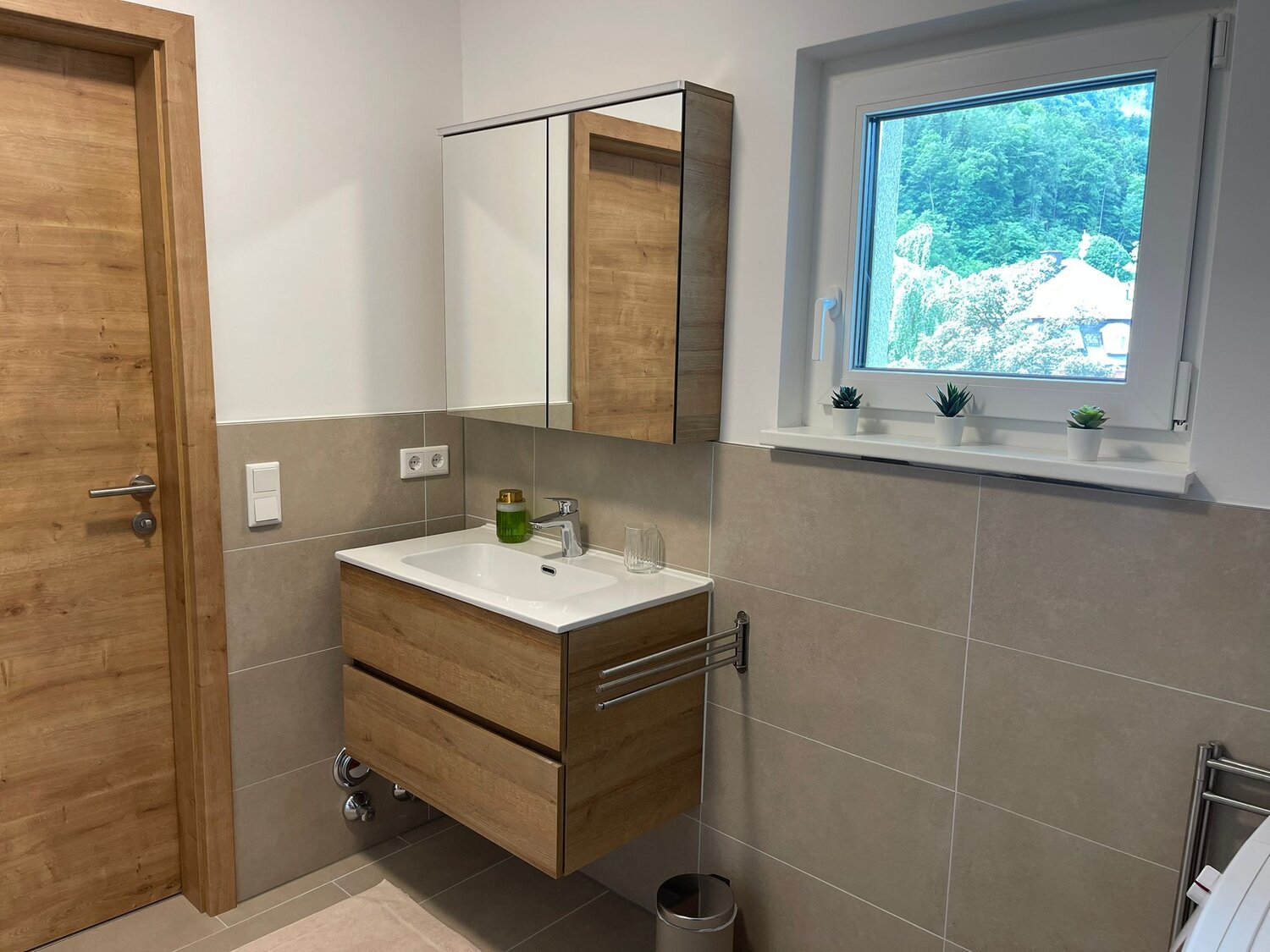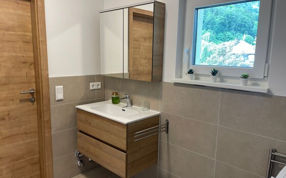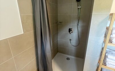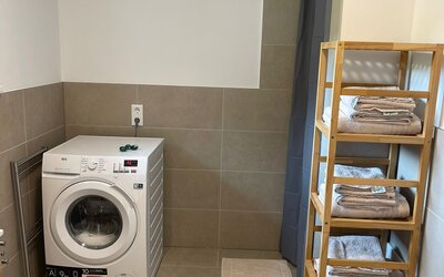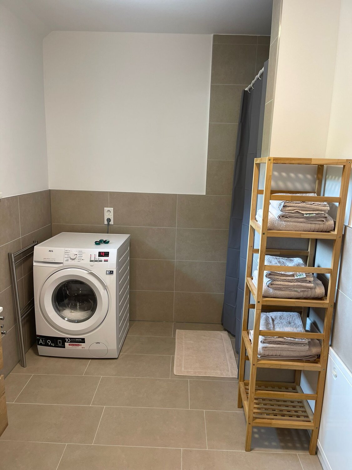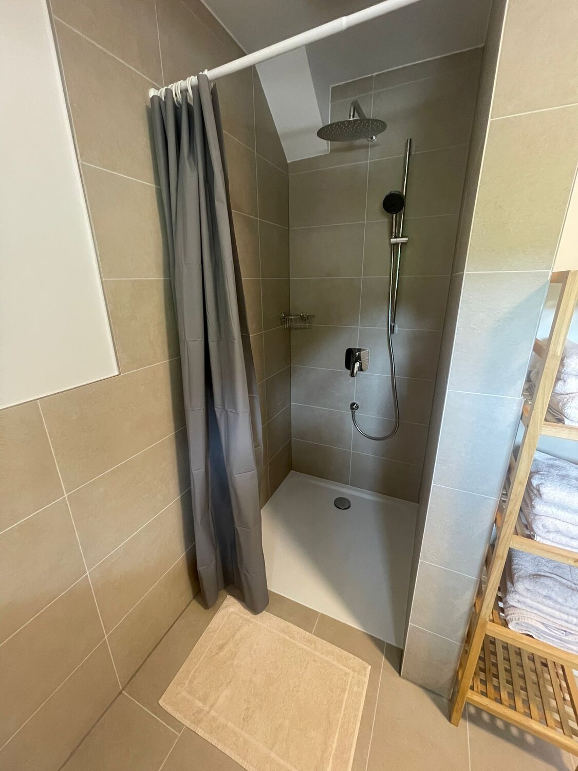 Das Badezimmer in Appartement 3 ist geräumig und mit einer Regendusche, einem Waschbecken sowie mit einer Waschmaschine ausgestattet. Ausreichend Hand- und Badetücher liegen bei eurer Ankunft bereit. Ein Föhn ist ebenso vorhanden.