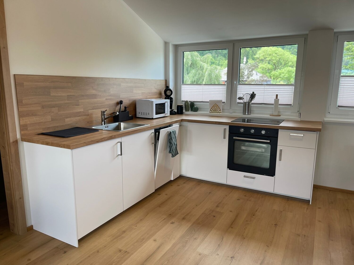 Die Küche ist mit Herd, Backrohr, Kühlschrank, Geschirrspüler, Kochtöpfen, Geschirr, Besteck und Gläsern ausgestattet. Zum Essen lädt ein Esstisch mit Platz für bis zu 6 Personen ein.